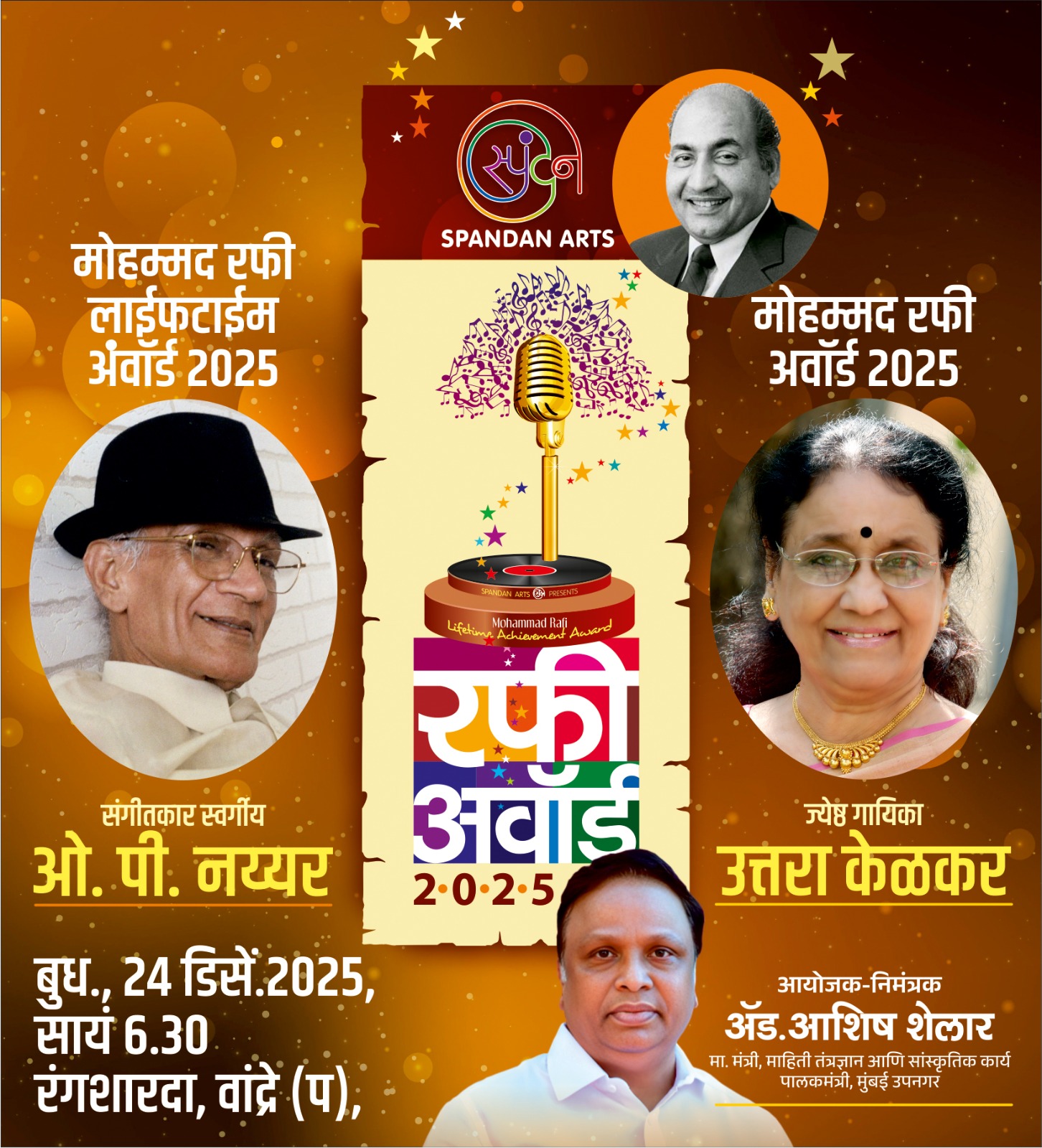 मंत्री अॅड. आशिष शेलार यांच्या स्पंदन या संस्थेतर्फे मोहम्मद रफी यांच्या वाढदिवसा दिवशी त्यांच्या स्मृती प्रित्यर्थ दरवर्षी एका संगीत क्षेत्रातील ज्येष्ठ कलावंताला जीवन गौरव व मोहम्मद रफी पुरस्कार देऊन गौरवण्यात येते. पुरस्काराचे हे 19 वे वर्ष असून एक लाख रूपयांचा धनादेश स्मृतीचिन्ह आणि शाल श्रीफळ असे जीवनगौरव पुरस्काराचे स्वरूप असून, ५१ हजार रूपयांचा धनादेश आणि मानचिन्ह असे रफी पुरस्काराचे स्वरूप आहे.